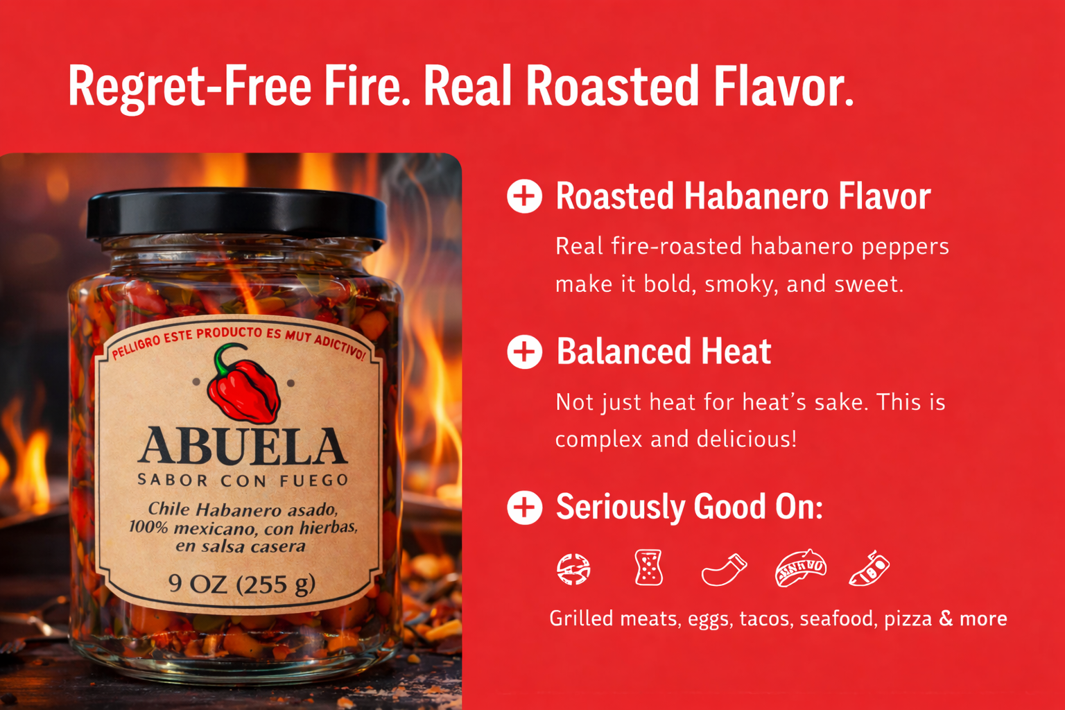 ABUELA β Chile Habanero Asado is made with whole roasted habanero peppers, slow-cooked to unlock their natural sweetness and smoky intensity. The heat is realβbut itβs balanced, rich, and incredibly addictive.
